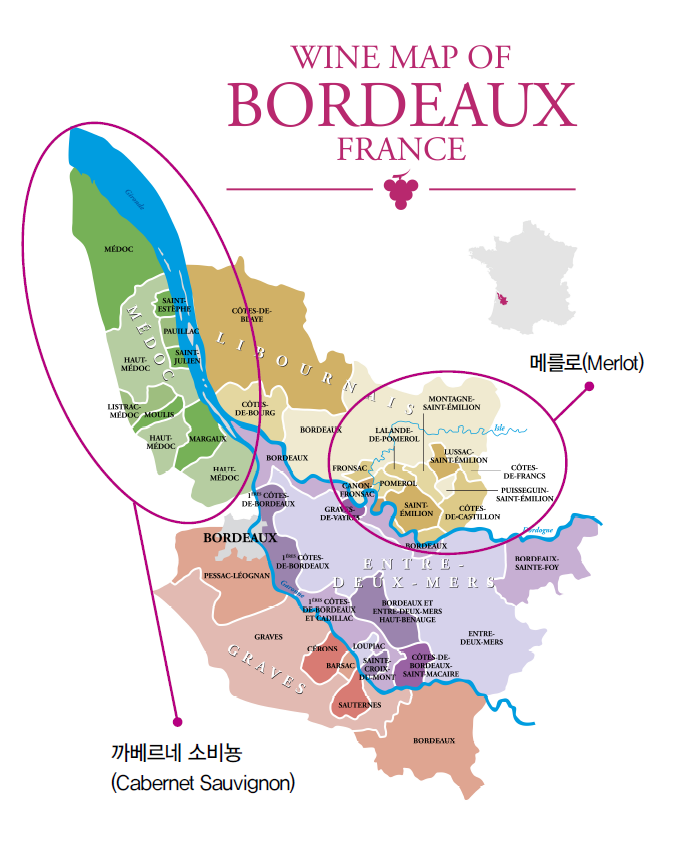 까베르네 소비뇽은 레드 와인의 왕이라고 불린다. 프랑스의 보르도 지방에서 블렌딩 와인을 만들 때 사용되는 주요 품종이다. 메독과 그라브 지역에 61개의 그랑 크뤼 끌라세 와인들을 만드는데도 주로 사용된다. 보르도의 5대 1등급 그랑 크뤼 끌라세 샤또에 대해서 익히 잘 알고 있을 것이다. 메독 지역에 위치한 샤또 라피트 로췰드, 샤또 무 똥 로췰드, 샤또 라뚜르, 샤또 마고 그리고 그라브 지역에 위치한 샤또 오브리옹이 이들이다. 이 5대 샤또의 와인들을 만드는데도 까베르네 소비뇽이 주로 사용된다.