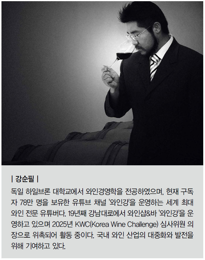 2025년 9월호를 통해 처음 와린이들을 위해 알.쓸.와.상 코너를 시작했다. 해당 원고들은 유튜브 와인강 채널에서 와인상식이라는 재생목록으로 이미 업로드 된 원고들이다. 28년 전 그 옛날 와인에 대해서는 아무것도 알지 못해 와인 용어만 들어도 머리가 하얗게 되던 시절이 여전히 또렷하다. 외국인이 김치를 이해하기 위해서는 적어도 배추가 무엇이고 무가 무엇인지 알아야 한다. 또 포천 이동 막걸리가 무엇인지 알기 위해서는 포천에 1동과 2동이 있어 포천 2동에서 나오는 막걸리라는 간단한 지명을 알아야 한다.