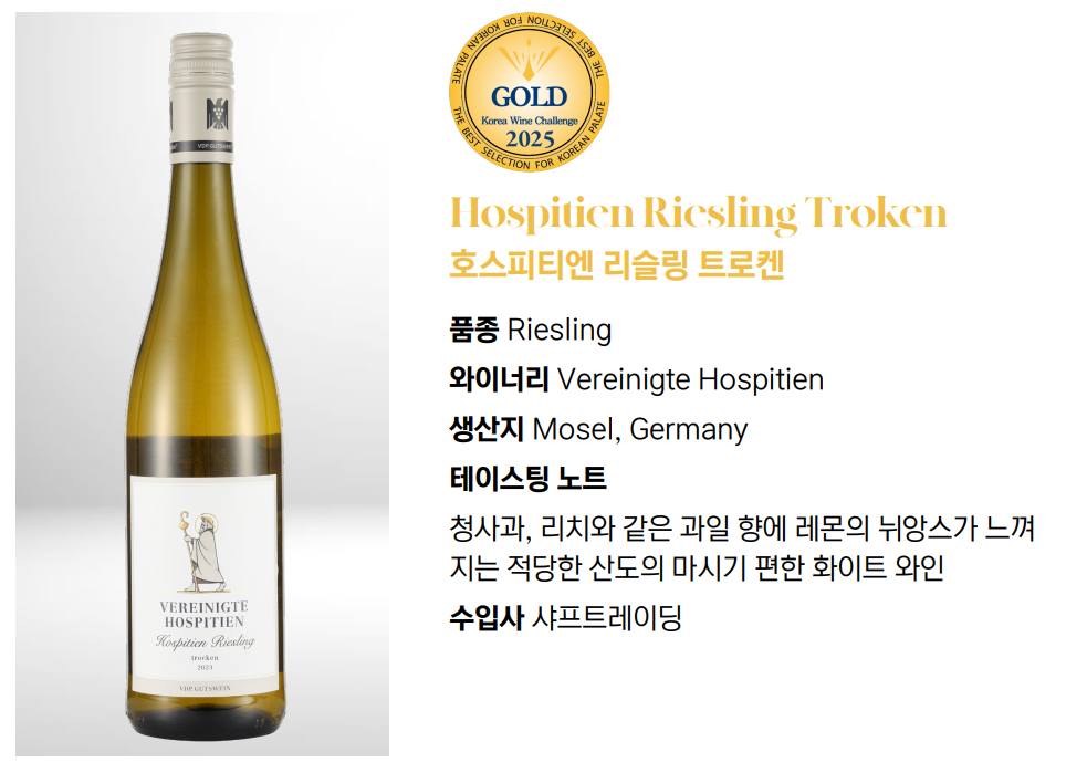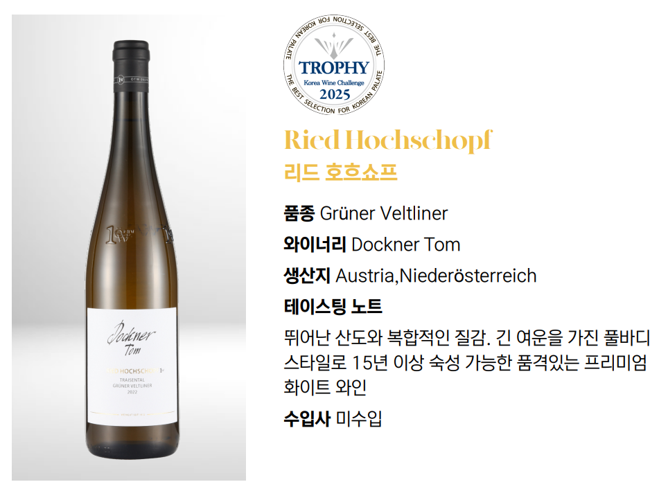 KWC 2025 트로피 화이트 부문 수상작 ‘리드 호흐쇼프’를 비롯하여, 2024 트로피 레드를 수상 와인인 ‘라 리오하 알타 비냐 아라나 그란 레세르바’를 포함한 ‘와이라우 리버 소비뇽 블랑’, ‘핑카 엘라 엘 마소’, ‘브랑까이아 끼안띠 클라시코 그랑 셀레지오네’, ‘호스피치엔 리슬링 트로겐’ 등 우수한 성과를 거둔 14종의 수상 와인이 소개되었다. 행사에 참가하지 못한 일부 수입사의 협찬을 통해 마련되어 방문객들에게 수준 높은 테이스팅 경험을 선사했다.